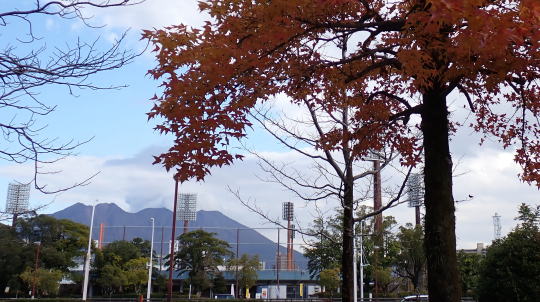 | 1/9 10:19 桜島を引き立てるような青空の広がり方が面白いと思って1枚 | 11:10 与次郎・おいどん市場前のクロガネモチの実。照明塔は白波スタジアム |