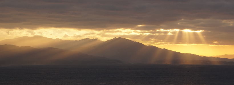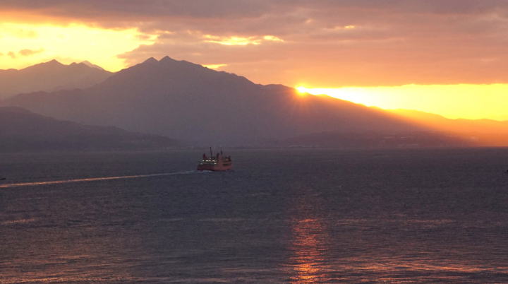 | 1/4 7:28 日の出。高隈山南部の山々、その各ピークがきれいに写っている。 手前から横岳、そのすぐ左隣が平岳、その左手に仲良く二子岳の二つのピーク、その左が妻岳。 二子岳の向こうに薄く御岳も写っている。2015年3月にその六つのピークを縦走している。高隈山南部縦走。刀剣山、横岳、御岳をご覧ください。 その時の上りは、累積標高差約1600m。ハードなコースだった。もう無理か?! |