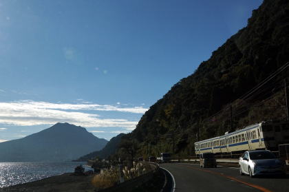 | 1/7 9:31 娘を空港に見送った後、好天だったし、帰りは10号線をもどる | 桜島とJR日豊本線 |