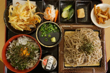 | 1/26 11:58 クリニック受診後、淳子さん、重則さんオススメの「木花館」御膳をいただく。 ソバ(トモちゃんは温うどん)がとくに、そしてシラス丼も美味しかった(完食!) |