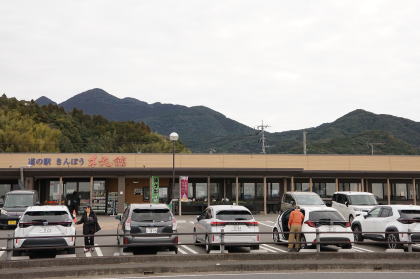12:31 道の駅・きんぽう「木花館」は金峰山の真西だった。 後景、左端の三角が北岳。その右隣一番高いのが中岳(636m)、その右が東岳 |