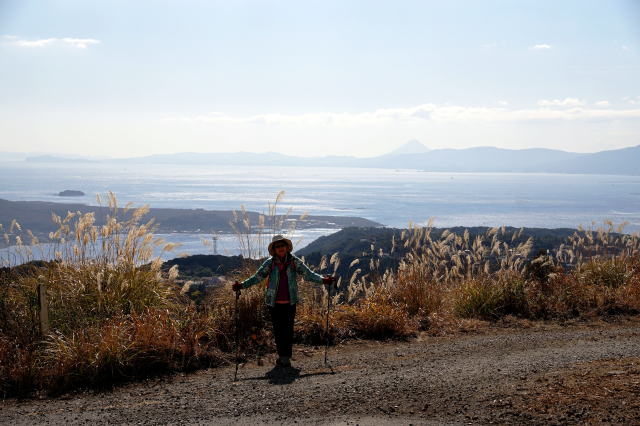| 2/4 12:34 左手に桜島の沖小島、中央からやや右手にうっすらと開聞岳 昨年末大晦日、牟礼ヶ岡がよかったので、好天のこの日、また足を運んだ |