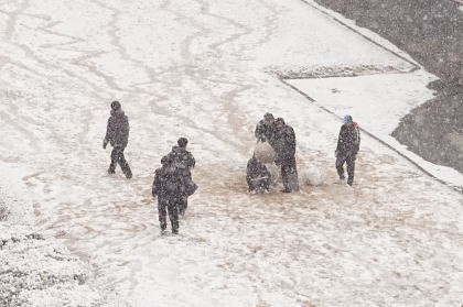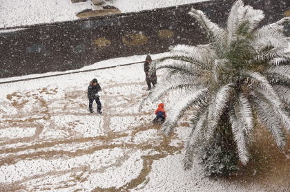 | 2/8 予報通りの降雪 8:52 緑地公園で親子が雪だるま遊び | 若者は相当大きいのを作っている.。朝9時前からだ 南国では雪遊びの機会がめったになく、待ちに待っていたのかもしれない |