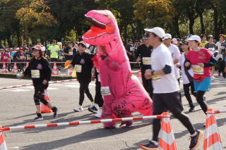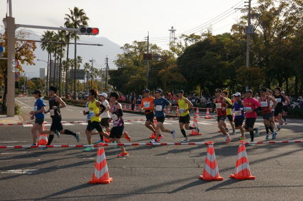 | 3/1 8:50 鹿児島マラソン、鴨池運動公園付近。トップ通過約5分後 | 9:28 この仮装で、よく走れるもんだ! |