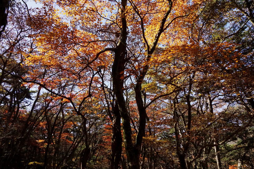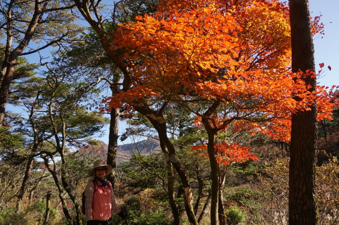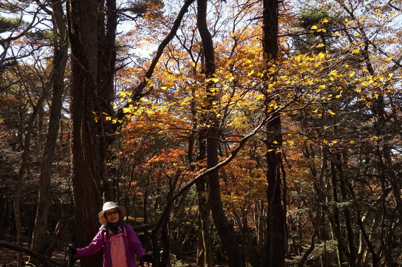 | 14:20 むこうに韓国岳も写っていてきれい。 このコハウチワカエデは、帰りに逆光を通して輝きを増す! |