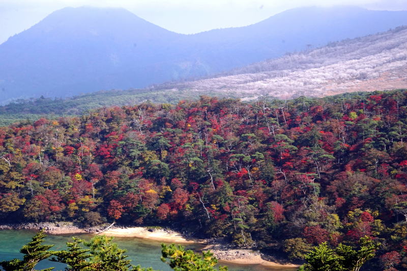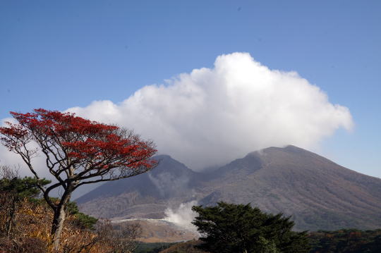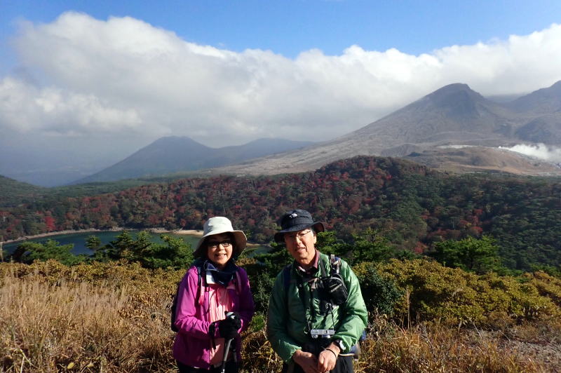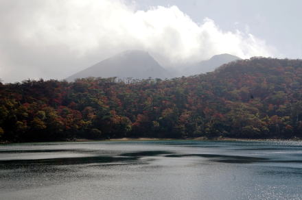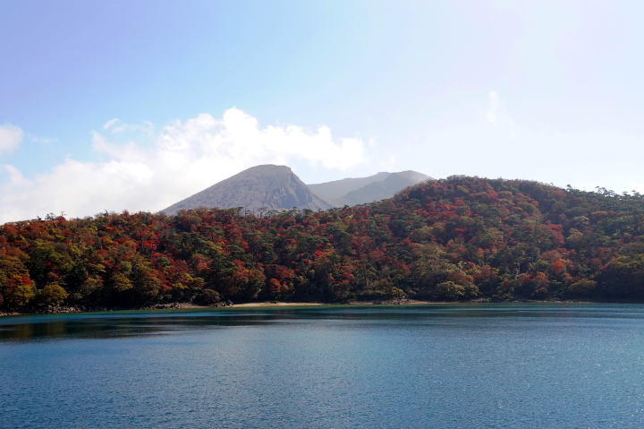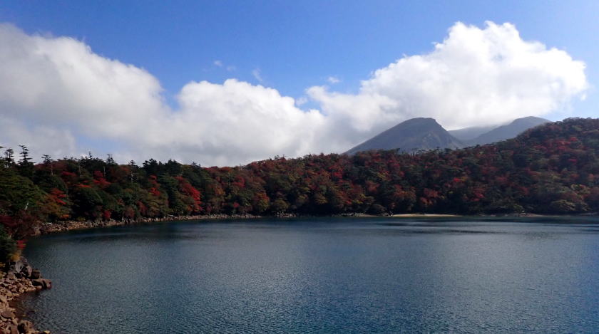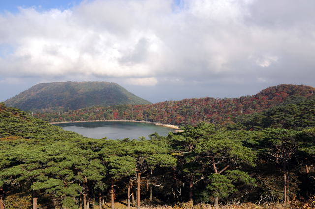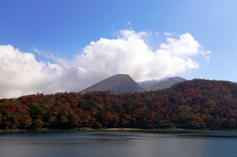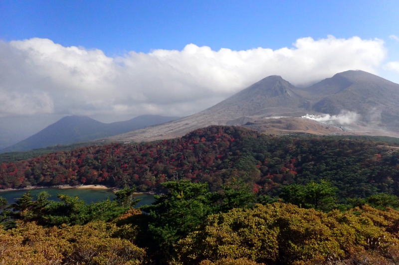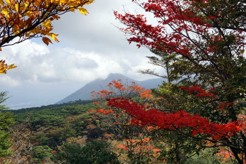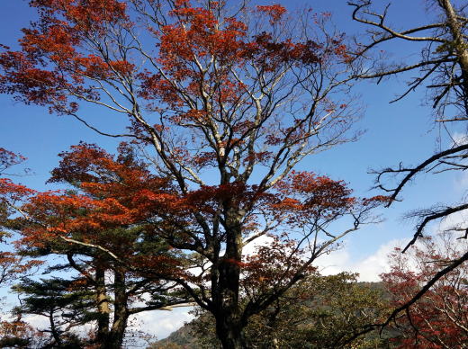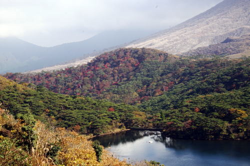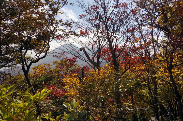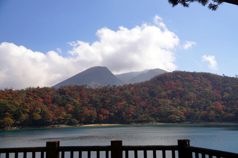 | 11:55 六観音御池を半周以上して、紅葉の間から韓国岳北峰を望む |